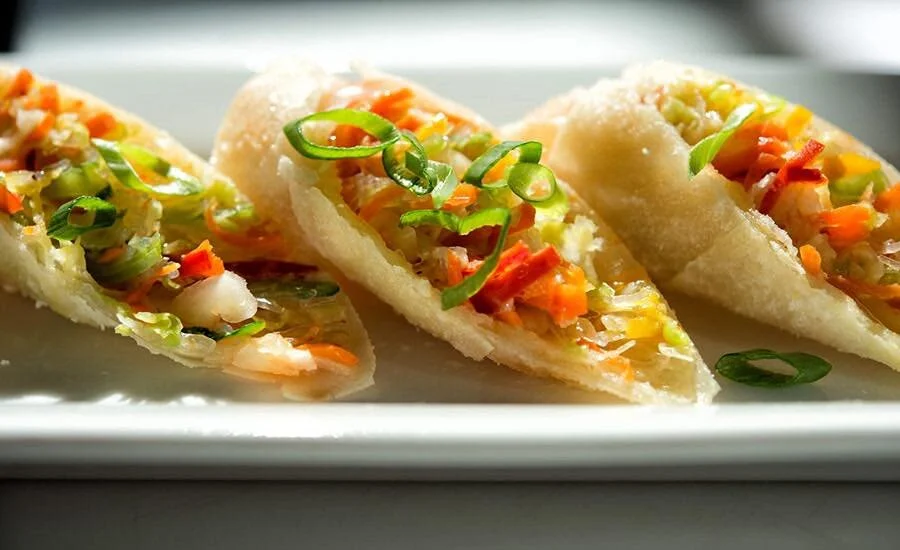 Napa cabbage, carrots, bell peppers, cashews, wontons, rice noodles, black & white sesame seeds with Asian dressing.